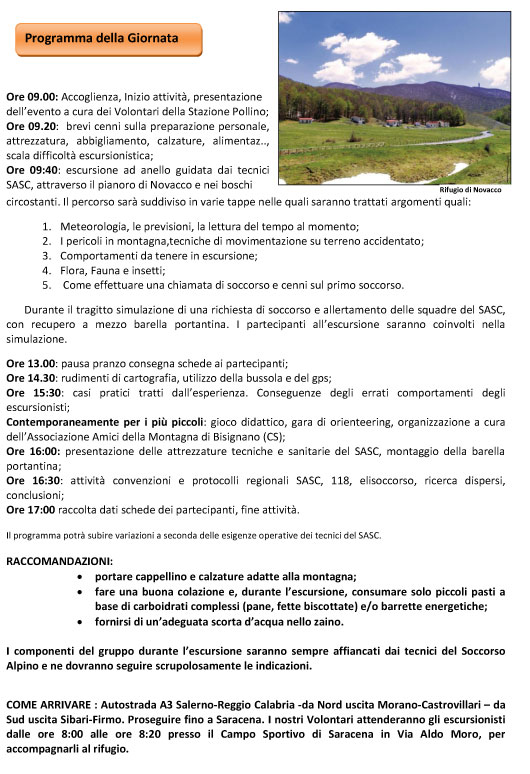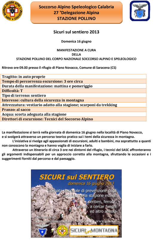 Siamo stati invitati dal nostro socio Luigi Vincitore, Vice Capostazione del CNSAS Pollino (Soccorso Alpino) alla manifestazione Sicuri sul Sentiero 2013 organizzata per domenica 16 giugno presso il rifugio di Piano Novacco nel Comune di Saracena (CS). La presenza e la partecipazione a questa manifestazione sarà per la nostra associazione occasione gradita di incontro oltre che di confronto e di arricchimento sugli argomenti che saranno affrontati, pertanto abbiamo aderito abbinandola all'iniziativa con le famiglie prevista per domenica prossima.