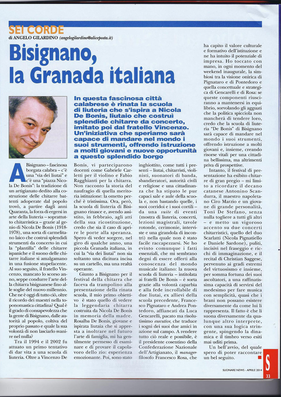 “…Un importante articolo del Maestro Angelo Gilardino sulla rivista di musica più diffusa in Italia,Suonare News. Questo insigne didatta e studioso della Chitarra- prestigioso musicista e compositore di fama mondiale - dedica la sua attenzione alla scuola di liuteria di Bisignano, la Granada italiana, come lui la chiama, e all’opera dei De Bonis.