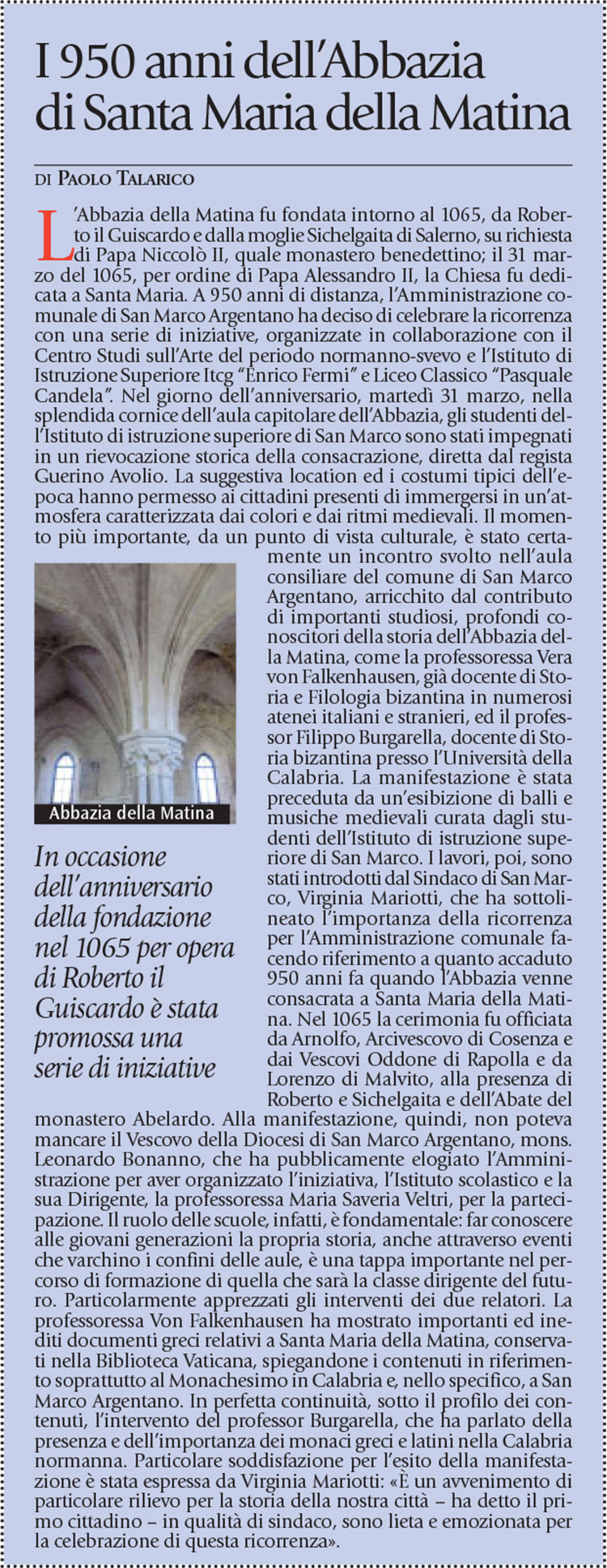 >Si segnala - tra gli altri - Articolo sui 950 anni Abbazia di Santa Maria della Matina