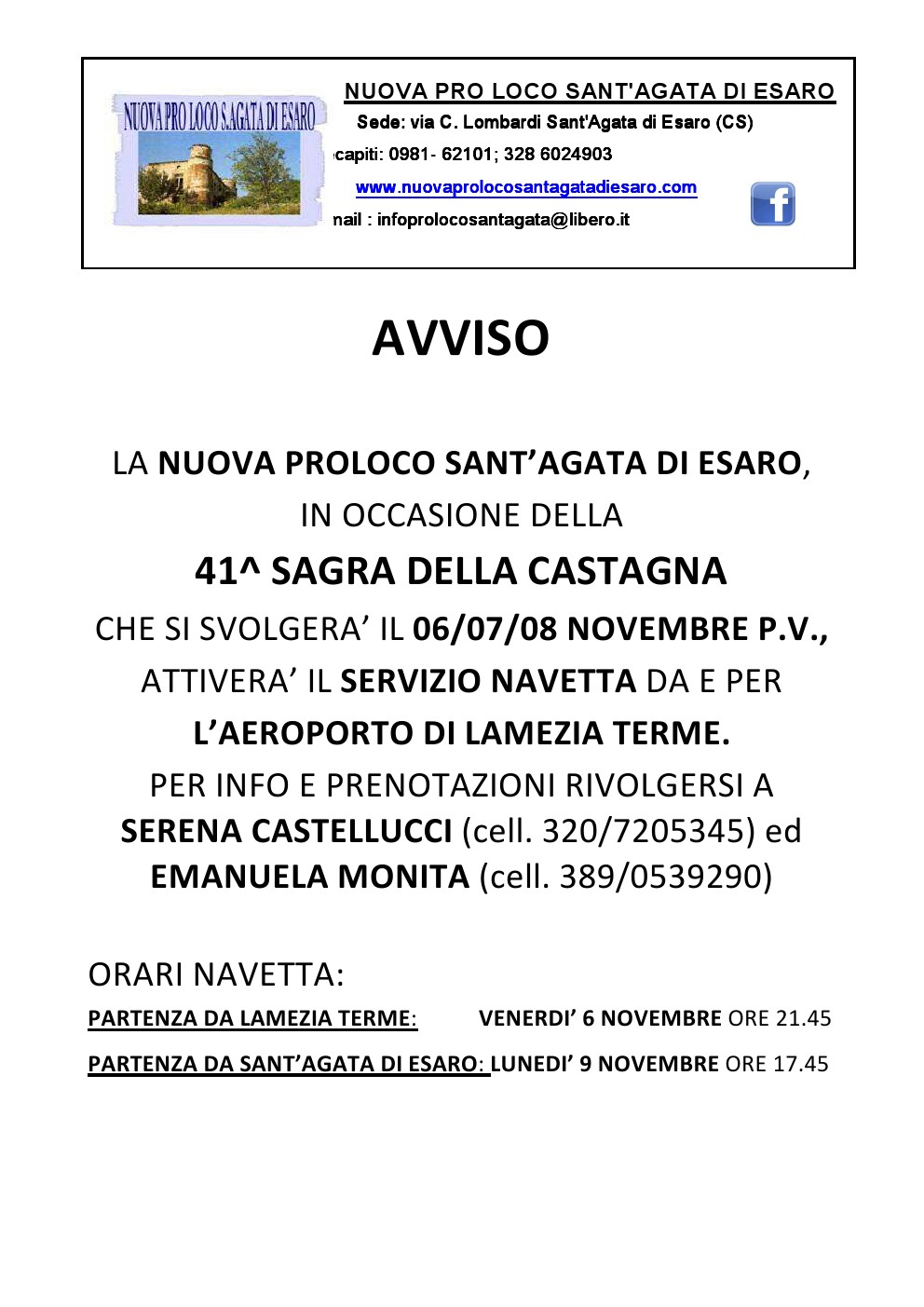 >Navetta Lamezia-S.Agata: per 41° Sagra Castagna