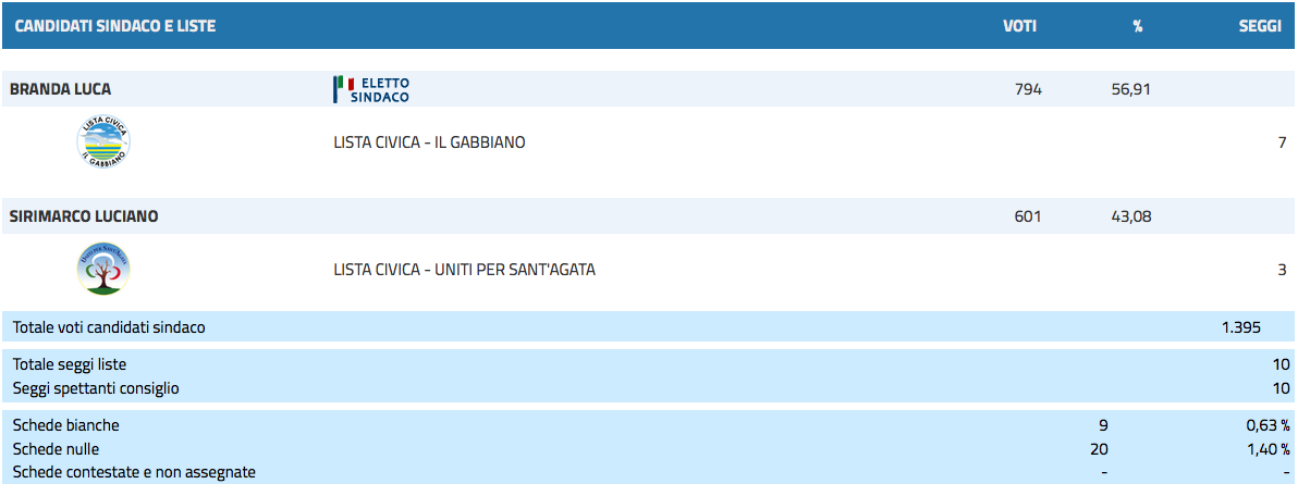 Preferenze Candidati lista UNITI PER SANT’AGATA • Giovanni Nocito 164 • Davide Laino 83 • Adriana Amodio 80 • Tommaso Spinelli 46 • Palmira Nocito 44 • Jolanda Servidio 32 • Gelsomina Gallo detta Mina 31 • Cristian Servidio 20 • Enrica Ciraudo 18 • Giovanni Ciraudo16 A elezioni concluse, il bel saluto tra il neo eletto Sindaco Luca Branda e il candidato Luciano Sirimarco.